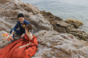 岩肌と海のコントラストが、ふたりの姿をより一層引き立てます