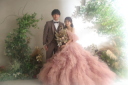 最後にカラードレスに。ピンクのISAMU MORITAさんのドレスにパープルブラウンのおしゃれなタキシードを。