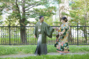 お嫁様は真っ白な白無垢に、当店オリジナル掛下である花柄の掛下をご着用いただきました。お婿様は黒とゴールドを基調とした紋付袴をご着用いただきました。