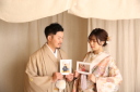 ライトブルーの打掛とブラウンの衣装をシンプルな背景で優しい雰囲気に。