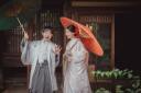 紅白の番傘が華やかで広いお庭のなかでも写真にアクセントをプラスしてくれます!