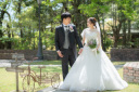 終始にこにこだったご新婦様ですが、クールな表情で!の声にはしっかりとポージングする姿がかっこいい!バックのグリーンに映えるドレスもまた美しいです。