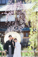 祇園エリアの通りにはさまざまな街路樹が。この日は桜と雪柳が同時に楽しめました!京都の街並みをお散歩するようにリラックスされているおふたりの自然な表情が素敵です。
