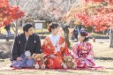 華やかなお振袖は、シックな黒紋付にも素晴らしくマッチいたしますね。お庭をお散歩されているおふたりのカットです。