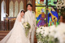 教会聖壇上ステンドグラスの前でプロポーズの瞬間を再現