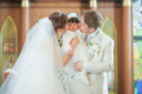 厳かな雰囲気の教会の中ライトを使用してロマンティックな仕上がりに