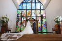 壁一面に広がる東北最大級のステンドグラスを背景に一枚