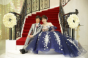 赤の打掛と赤絨毯の螺旋階段で。華やかな印象の写真に