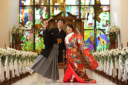 東北最大級のステンドグラスと華やかなドレスの組み合わせ。