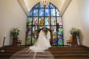 鮮やかに光り輝くステンドグラスの中におふたりの満面のスマイル