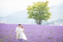 ラベンダー畑に合わせて、淡いパープルが入ったドライフラワーブーケを使って。