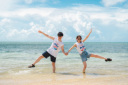 ドローンは沖縄の広い海をダイナミックに撮影できます!ドローンに向かって手を振っているのが、また可愛いですね♡