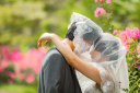ヴェールを少し肩にかけて花嫁感UP。ブーケもLAUGH PHOTOで無料レンタルできます。