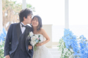 お花畑のなかでおでこを寄せ合うお二人の姿が美しいショットです