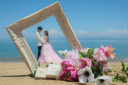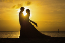 キラキラした夕方のビーチの中嬉しそうに寄り添う姿が微笑ましい