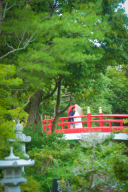 紋服姿で凛々しく。赤い壁と幻想的な光りが醸しだす雰囲気をお楽しみください。