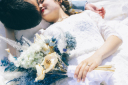 とても可愛いショットブーケで顔を隠してのKISSシーン