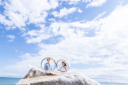 真っ青なビーチをバックにおでこを寄せ合うお二人の優しいショット