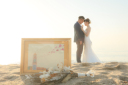ウエディングドレスではビーチへ移動して大切なアイテムと共にワンショット