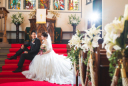 大きなステンドグラスが素敵なチャペルで撮影スタートです!!まずは王道の全身のショットから!チャペルではウェディングとタキシードがとても映えますね^^