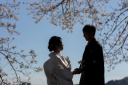 池周りを手を繋ぎながら歩いているお写真で、素敵なお着物デートです♪