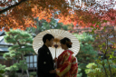 輪王寺和建築の中庭にて。紅葉の赤と白のシンプルな組み合わせが秋の雰囲気を引き立てます。