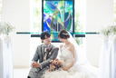 芝生や木の緑をバックにドレス、タキシード姿のおふたりが映える一枚に!