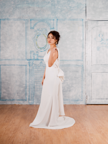 リボンのバックデザインが個性的。海外風のおしゃれな撮影希望の方に人気があります。街並みやチャプルまで様々なところでマッチします。ヌーブラ必須です。(モデル:156cm)
