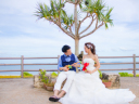 雨が上がった後のバス停で映画のようなウェディングフォトを撮影しちゃいましょう!背景は沖縄ならではの石垣と澄み渡る青空で思い出に残る撮影となりました♪