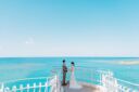 快晴に恵まれ海のブルーも鮮やかに輝く中での撮影。奥様のビビッドオレンジドレスと背景のカラーのコントラストがすてき。。