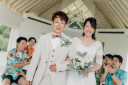 奥さまはフェミニンな淡いピンクのAラインドレス(No72)、だんな様はベージュのタキシード(NO23-2)。お二人の柔らかい印象にぴったりの衣装。お似合いです♡