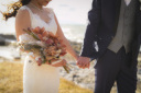シンプルなお色のブーケを持ってシックな1枚を撮影