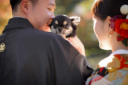 窓から柔らかく差し込む光に包まれながら,顔をそっと近づけるふたり。背景にあるお花がより一層華やかさを添え,和装の美しさと優しい空気感が調和した一枚です。