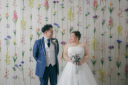 お花に囲まれてまずはカラードレスでの撮影!ドレスの後ろのデザインがわかりつつ雰囲気もあるお写真を撮影しました。