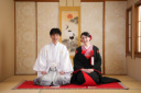 六華苑のお茶室で正座をした,おふたりの凛とした一枚。美しい姿勢と落ち着いた佇まいが和の空間に美しく映えます。