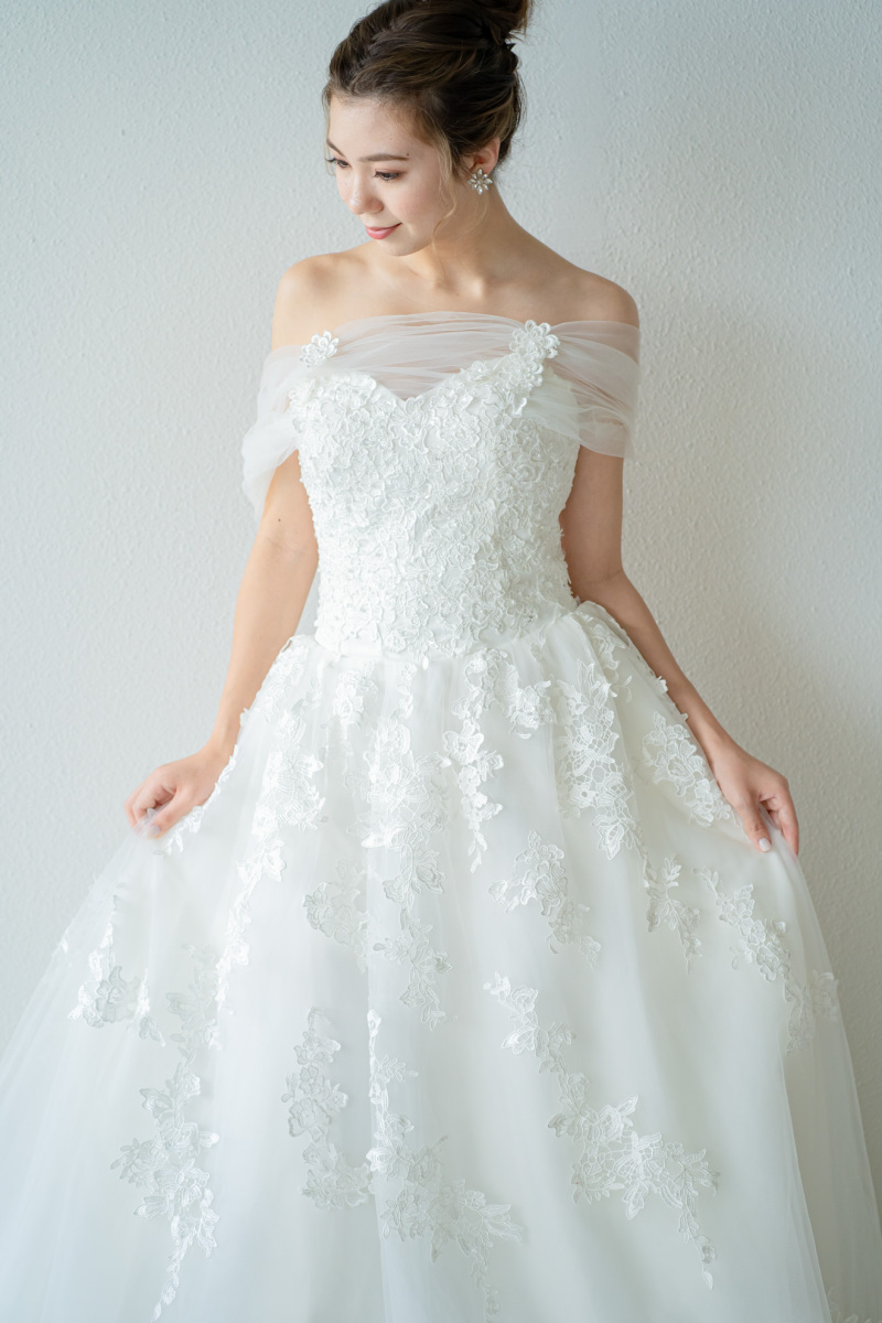 ふんわりシフォン素材のオフショルが可愛らしい1着。二の腕や胸元が気になるお客様に好まれています。ビーチでも緑が豊富なガーデンでも、沖縄らしいリゾートの雰囲気が感じられる、そんなデザインです。こちらは追加料金なしでご利用いただけます。