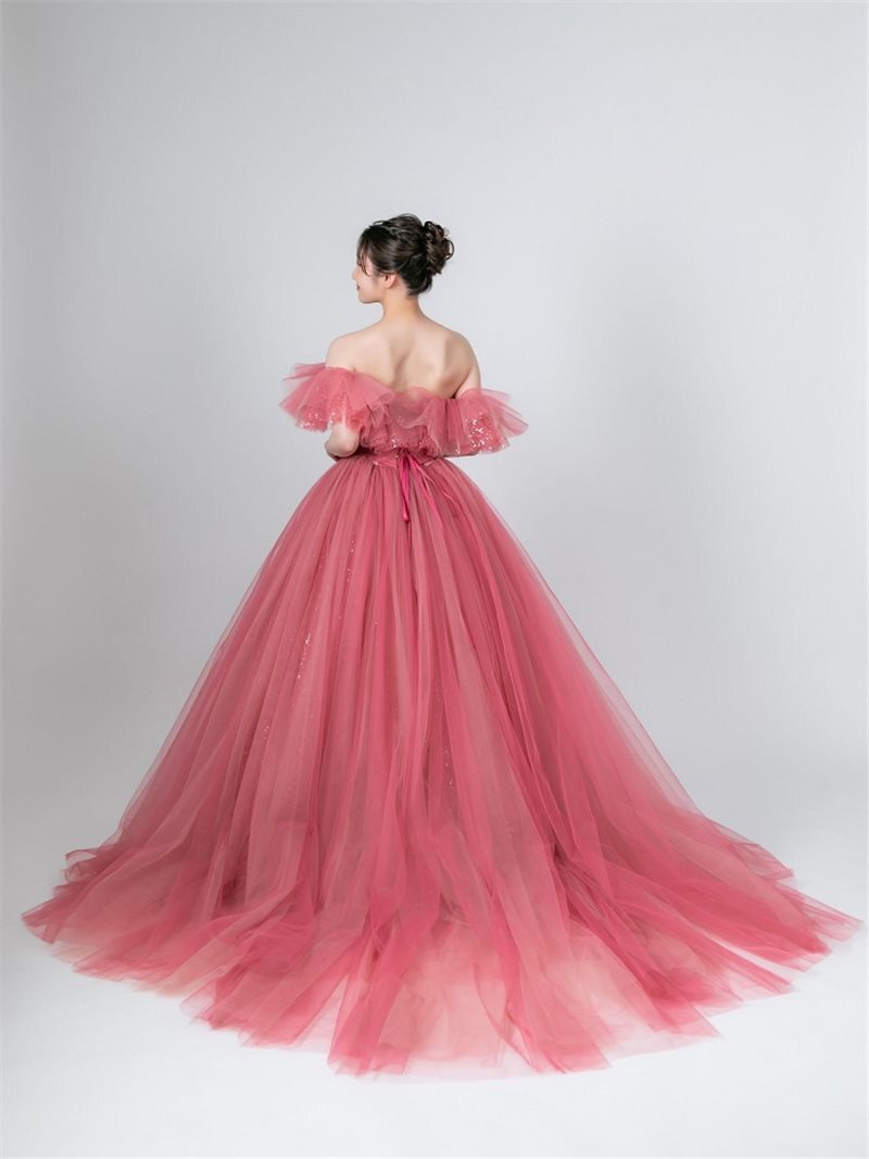 ドラマティックなボリューム感に心ときめくローズピンクのプリンセスドレス。 ボリューミーなラッフルケープに、ドレープでシェイプされたコンパクトなハートネックの身頃、ピンクやベージュのチュールを重ねたグラデーションを感じるエアリーなスカート。