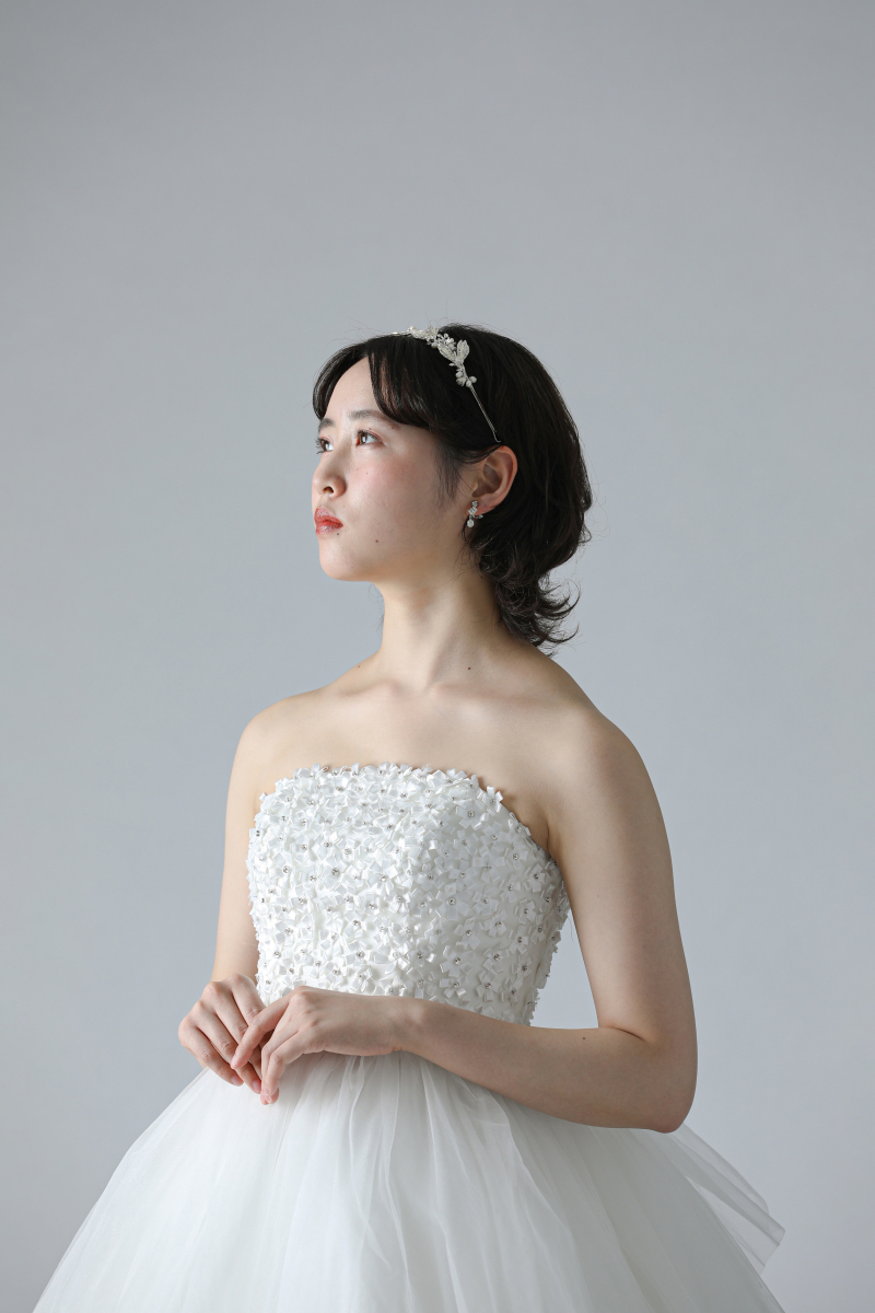 お花型のビジューモチーフをあしらったビスチェと、ボリューム感たっぷりのホースヘアのスカートが魅力的です!