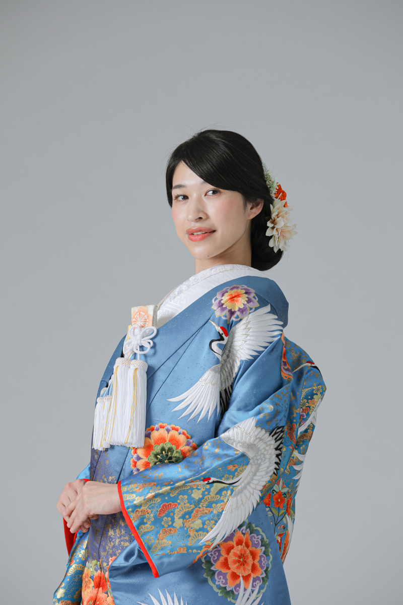 ブルーブラックグラデーション。鶴と丸文が鮮やかにデザインされた打掛。