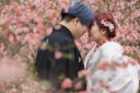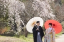 桜の園の中にある切り株に腰掛けて、自然な雰囲気で◎