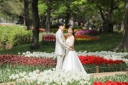 ピンクのチューリップからお二人をパシャリ!ご新郎様の髪色とマッチしていますね!