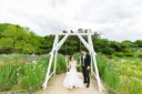 周りには、緑やピンク、黄色など色とりどりのお花があります。お二人の優しい雰囲気が伝わってきます