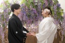 見つめ合った瞬間にご新郎様の輝く笑顔が!輝く桜と共に歩みを進めます!