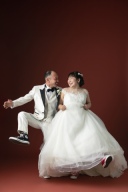 台紙に載せる正式な立ち姿のポーズ。お二人とも扇子を持ち、全身を写したショットになります。
