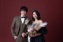 紅色の椿の花と一緒に。お二人の笑顔がとても素敵です♫