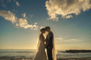 おふたりのまなざしが重なった先には、どこまでも続く水平線と、そこに向かって沈みゆく太陽が。一日の終わりに輝きを増した太陽が、おふたりの横顔を照らす。