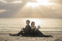 撮影もいよいよ大詰め。ビーチに並んで寝転がります。背後からサンセットに照らされながら、至近距離でお話しする表情にも、どこか達成感がにじんでいらっしゃいます。