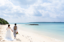 砂浜をゆっくり歩くおふたりをカメラに。おふたりの後ろには伊良部大橋も見て撮れますね。