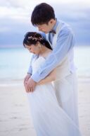 白いスーツを爽やかに着こなし海辺を歩く新郎。向かう先はもちろん、、、