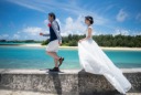 何層にも広がる海が美しい海を背景に ウェディングフォトが始まる